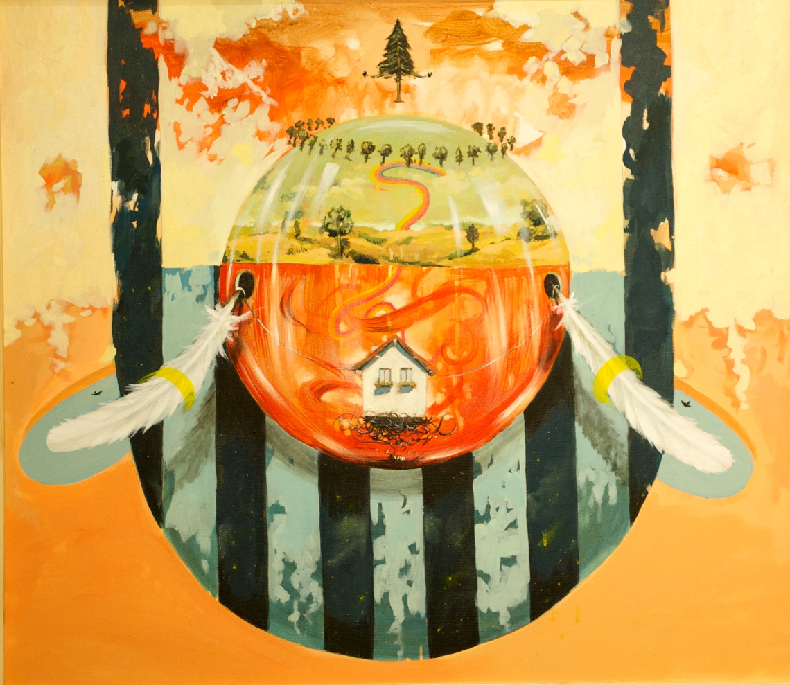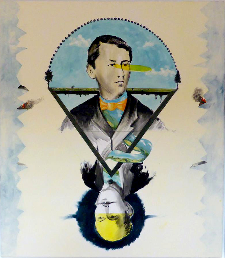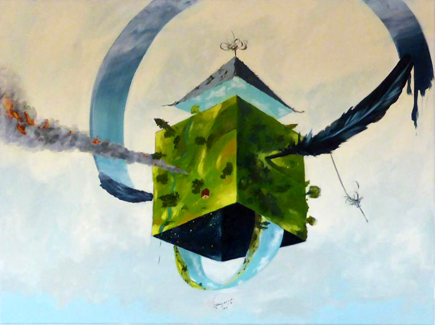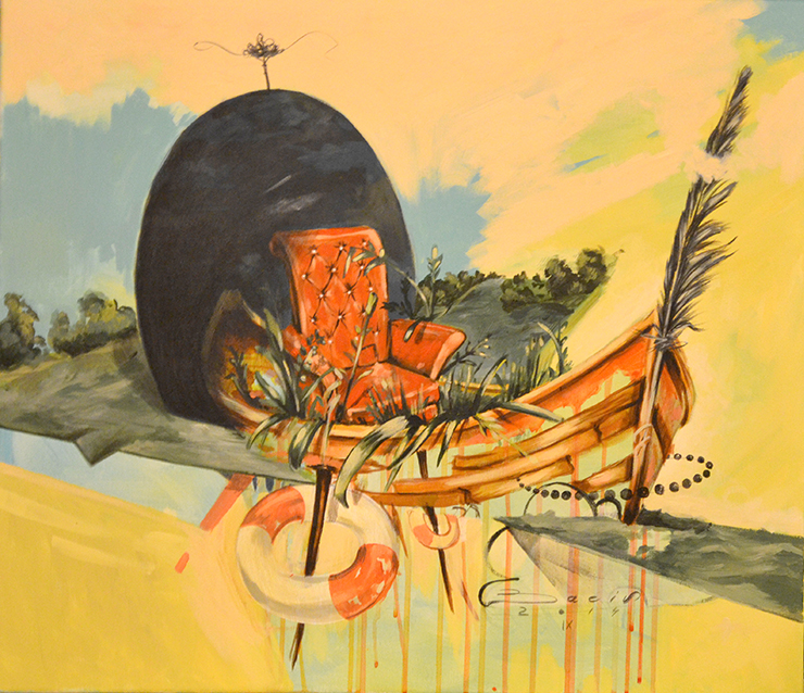 There are powerful juxtapositions and collisions of elements in his artworks, taking us simultaneously through different dimensions and experiences. He also plays with geometry, that he inserts in nature, and uses symbols of transportation such as boats and cars to carry his new worlds, that he adapts to his pop-surreal approach.