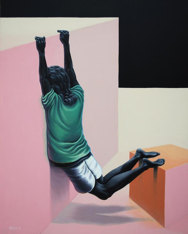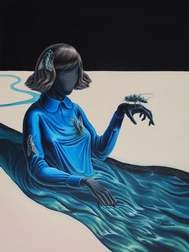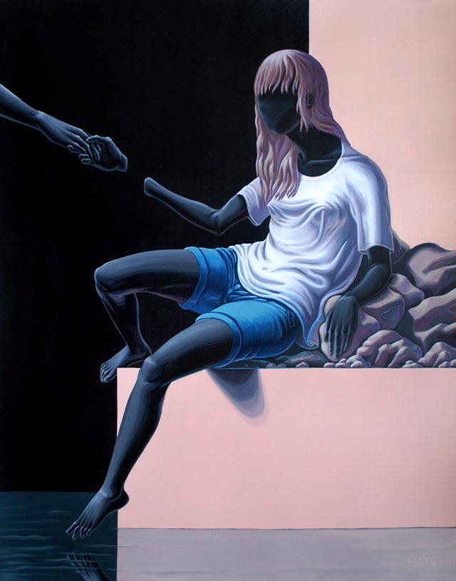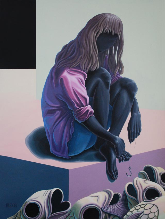 The works of Alex K. Gardner are a constant exploration of human nature, which the artist links to water symbols and fluid images, in an unusual cube patterned surreal landscape.