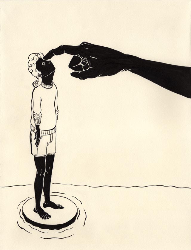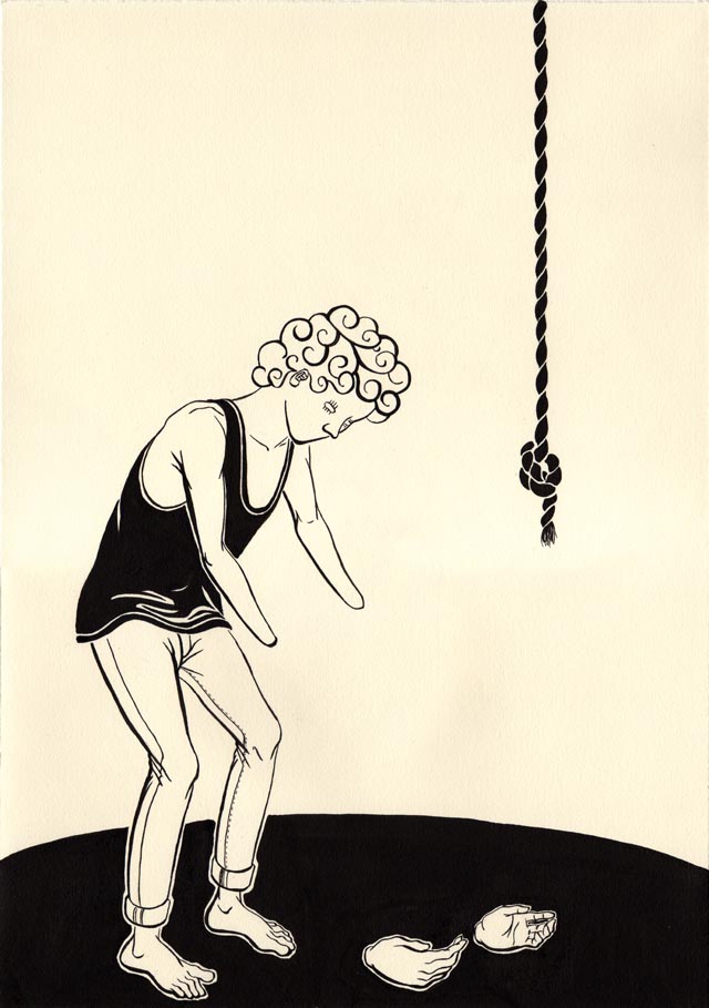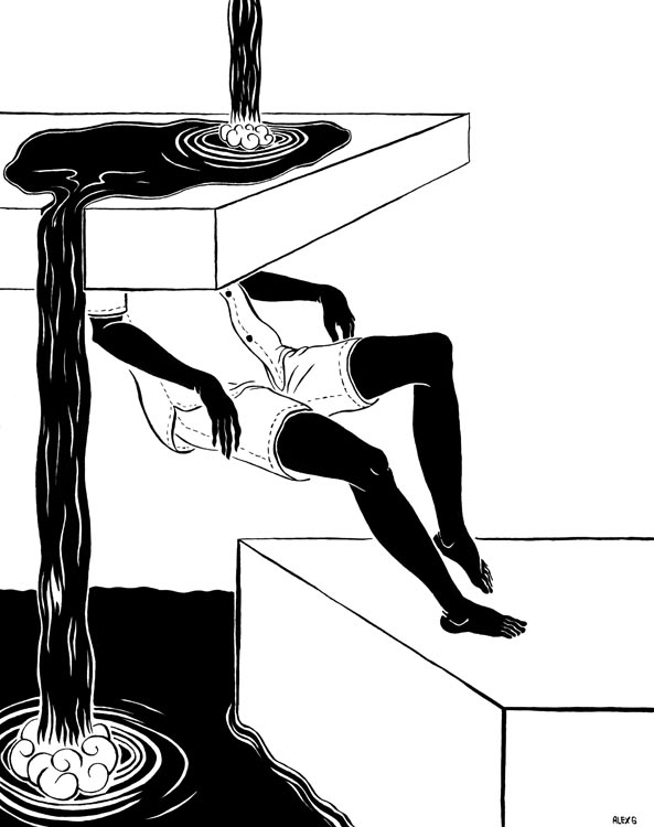 Driven or confronted with a force greater than their own, his minimal, often faceless, characters express desire, anxiety, sadness, or the hardship to achieve what they long for.