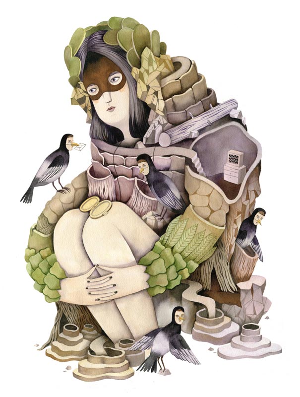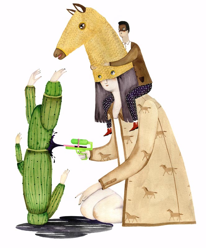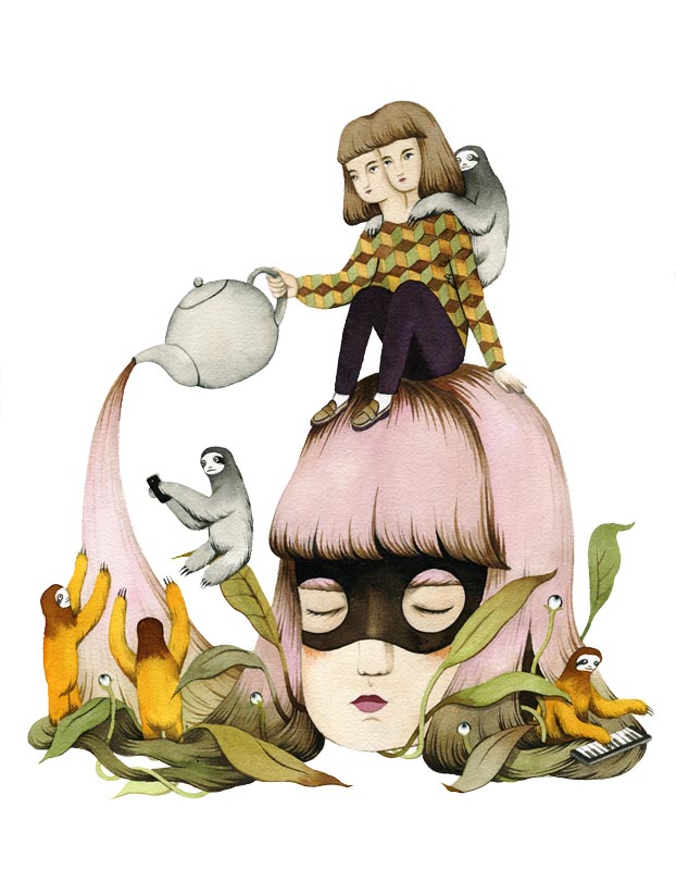 The illustrations are usually personal, and the characters often resemble their author, becoming surreal self-portraits harmoniously connected to nature, to different plants and animals.