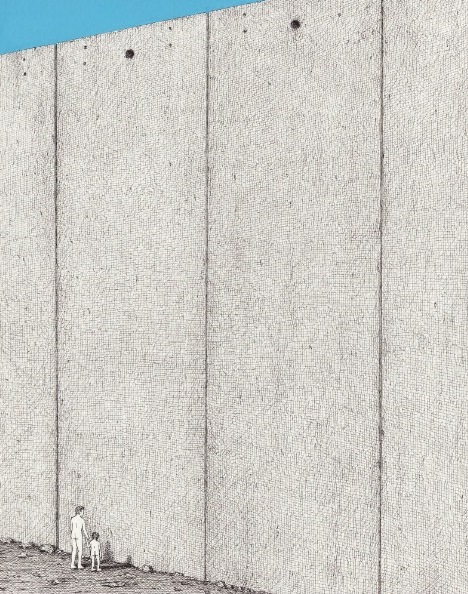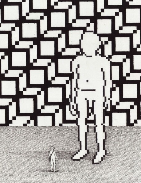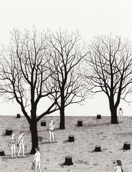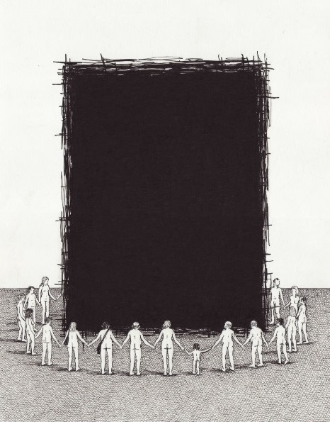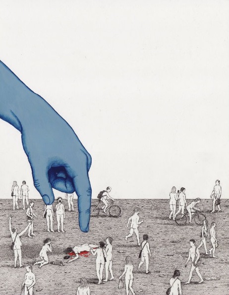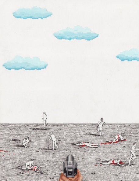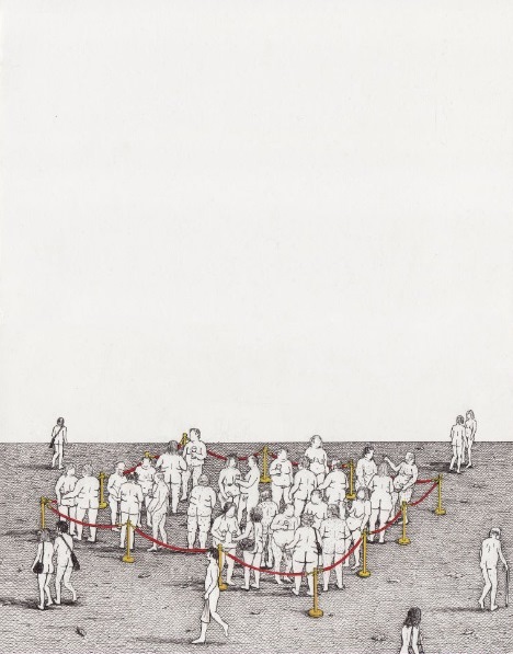 In this series, people are illustrated with no clothes, faceless and lacking any traces of individuality and personality. Unconsciously wandering from one point to the other with their bicycles, taking photos and carelessly carrying their backpacks, presented as couple or family in some cases, their slightly ambiguous and bizarre behavior may point out their incapability of clear understanding of the time and space they exist in, as they walk almost undisturbed by what surrounds them, mostly indifferent to the other, rarely questioning and resisting higher powers and authority (neither alone nor together). We see this curious species, which we believe the artist intends to be a reflection of mankind’s current state, worshiping nothingness, lost in a virtual reality which they might have created, but no longer control, we learn their stereotypes and sense their frustration, fears, hopes, beliefs.