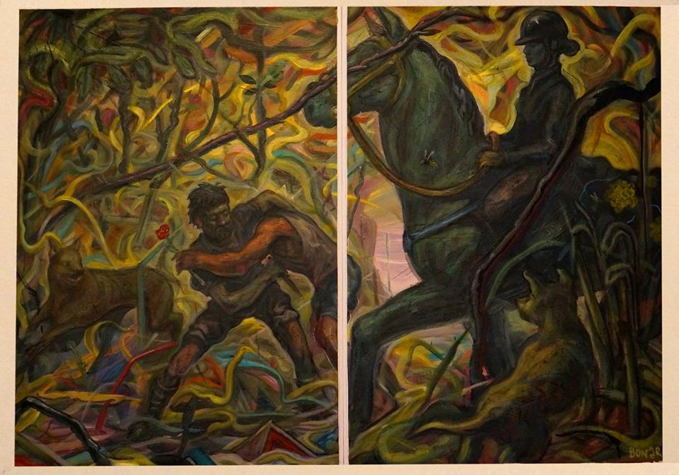 Bonar creates his own mythology, dark and captivating, his own twisted deities, rulers and underdogs, inviting the viewer to wander around and discover his excellent realms of rich and unlimited imagination.