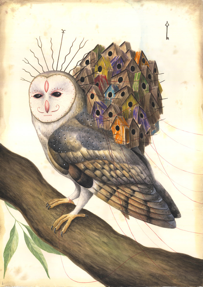 El Gato Chimney finds inspiration in the interest for science and especially in the passion for all that creates wonder, building his own universe filled with symbols and populated by fictional and hybrid beings, each carrying its enigmatic story or burden. The works explore subjects that are part of the artist’s constant research – primitive and sacred art, esoterism and spiritualism, folklore, magical realism in literature.