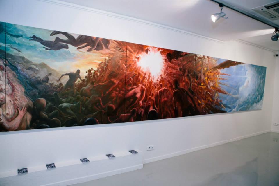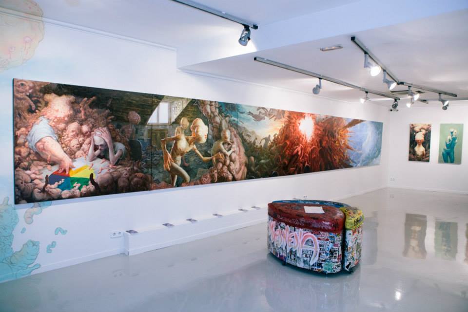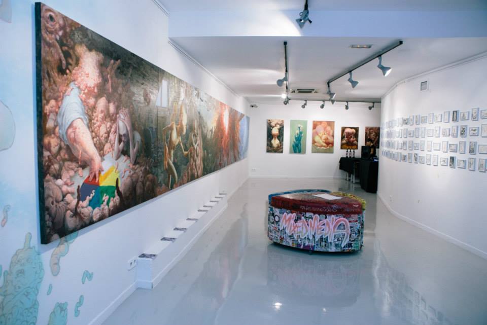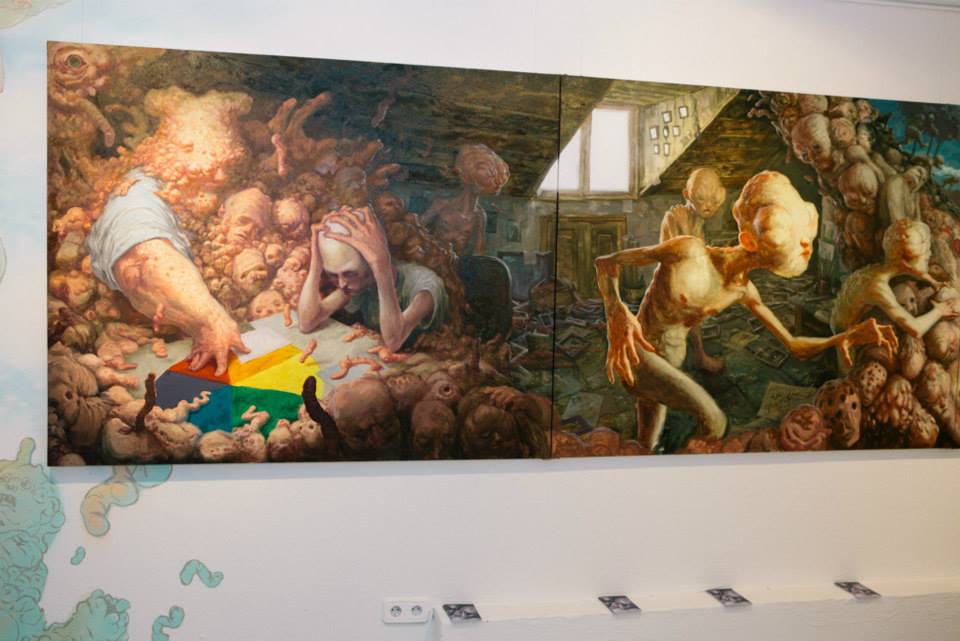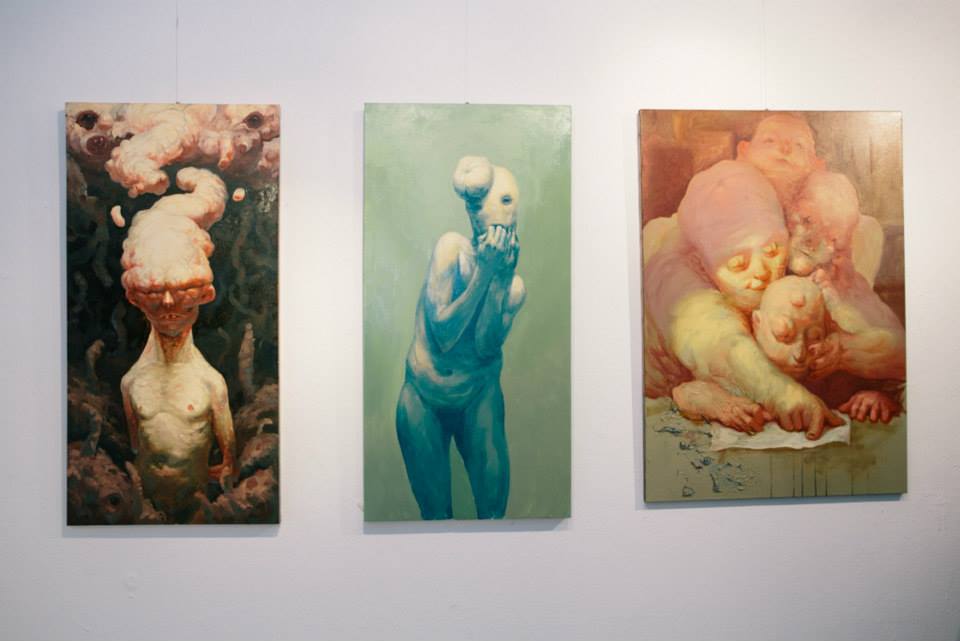 The exhibition reveals an interesting vision of the world, where curious creatures, organic shapes and fleshy bodies, are the protagonists in a varied series of paintings and ink drawings.