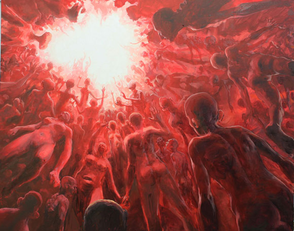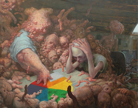 The works, some of them juxtaposed to create narratives, reflect, according to the gallery, the “desires and fears of people and their relationship with a man-made environment”. The works convey, indeed, a sense of deceit, resignation and lost hope in a reality that the individual no longer masters, but there also might be a suggestion, in this world that seems of no escape, of a constant search for a salvation beyond the limits of one’s universe, in line with others or through inner struggles.