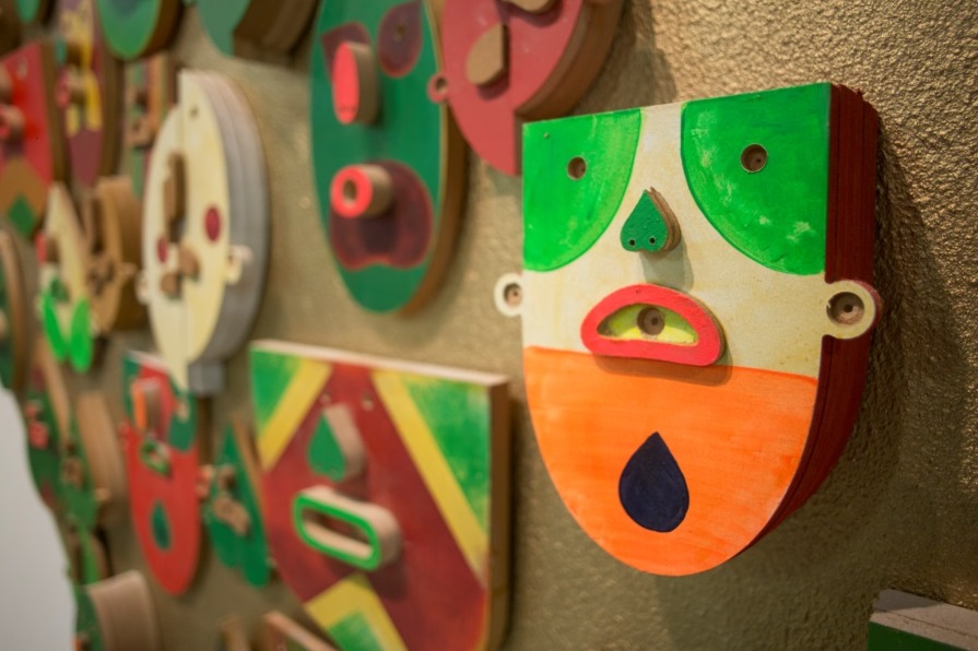 We like how the variety of colors, with a great focus on red and green, combines with specific symbols and geometric patterns that help construct the Brazilian inspired imagery, as well as the expressiveness of his distinctive characters. The installation view is also inspiring, allowing visitors to experience simultaneously different emotions and states, from a meditative state to inner happiness, highlighted through the masks of his beautifully outlined characters.