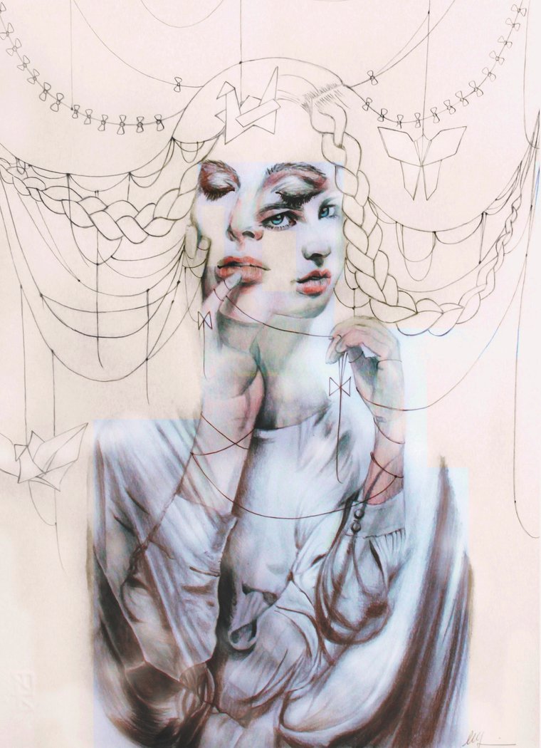 Mostly using mixed media on paper, her conceptual illustrations and emotive portraits reveal characters trapped in their own fears, locked inside their memories, tied up to their haunting and overwhelming experiences or growing cold as a result of their journey in life. Ropes become a visual metaphor for these inner struggles, while we also notice a peculiar geometry embedded in the works.
