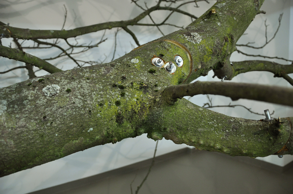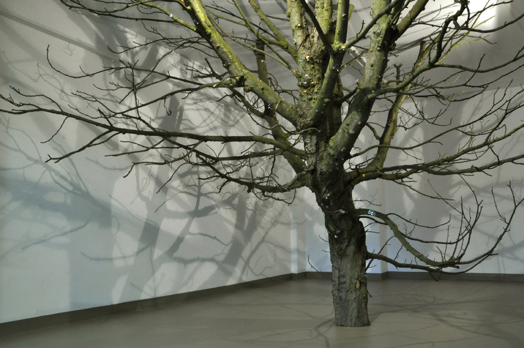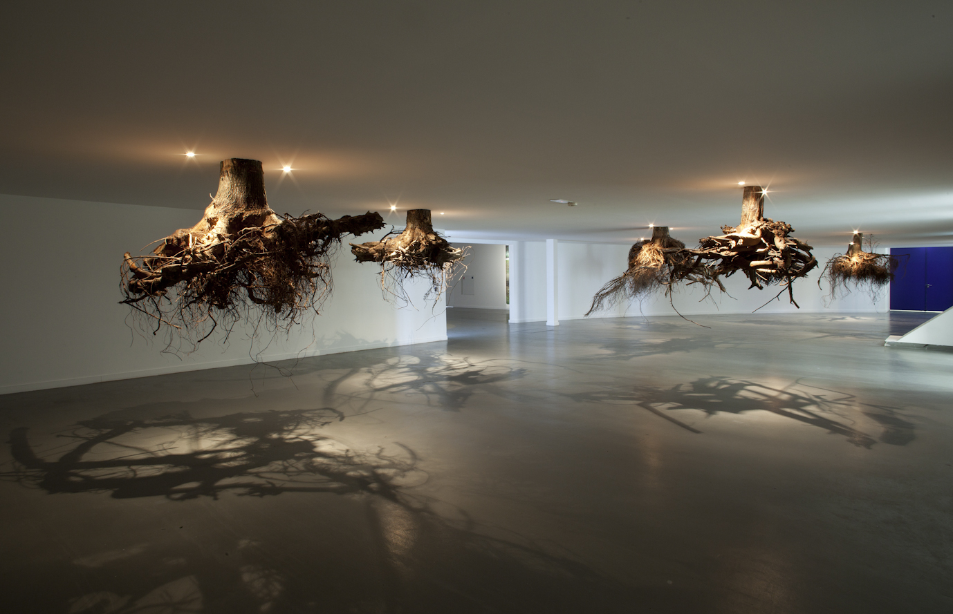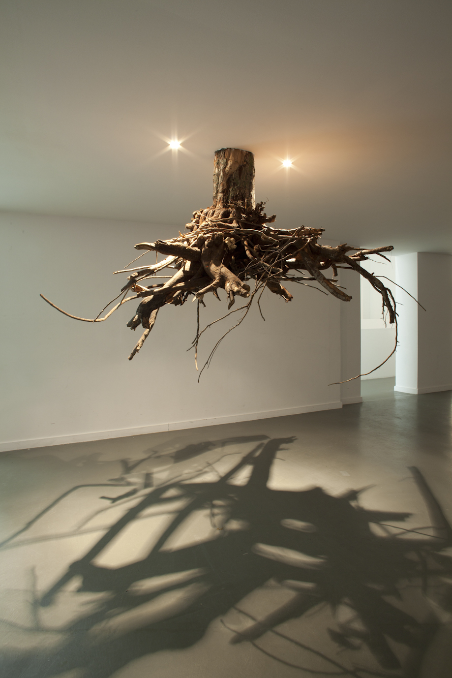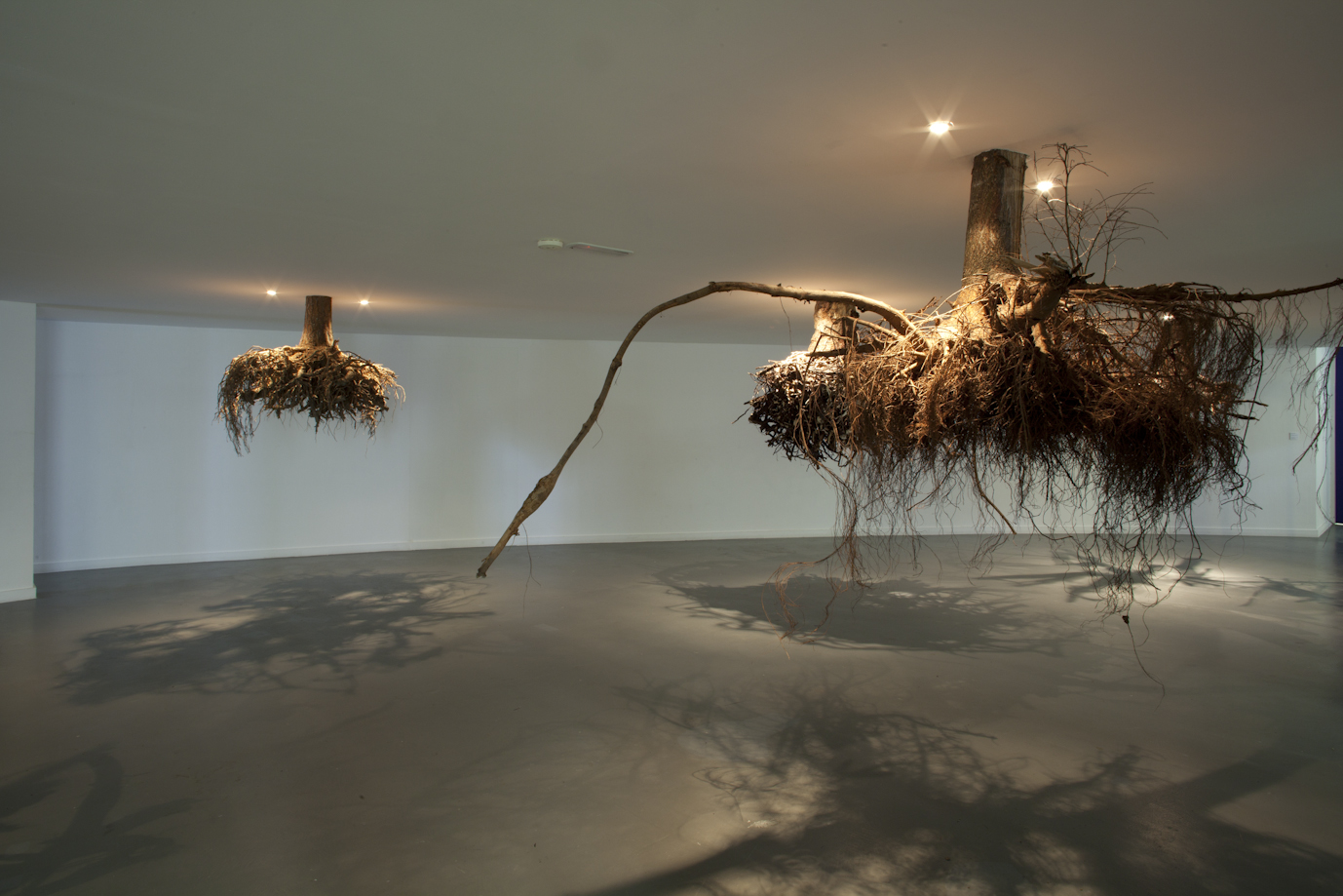 A site-specific installation with trees’ roots. Ceiling construction, trees’ roots, halogen lamps.