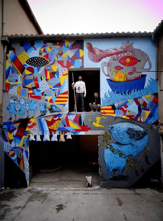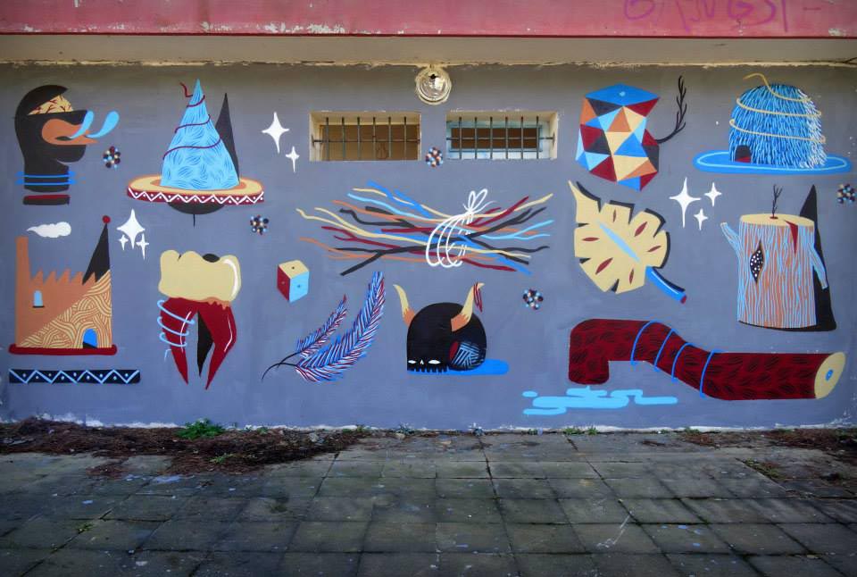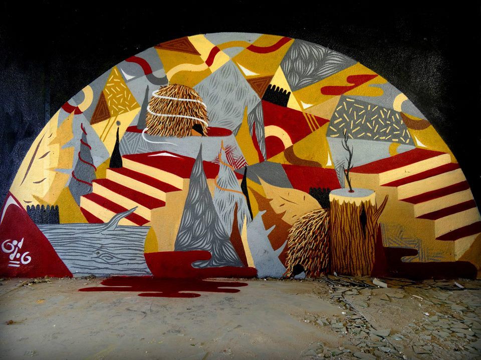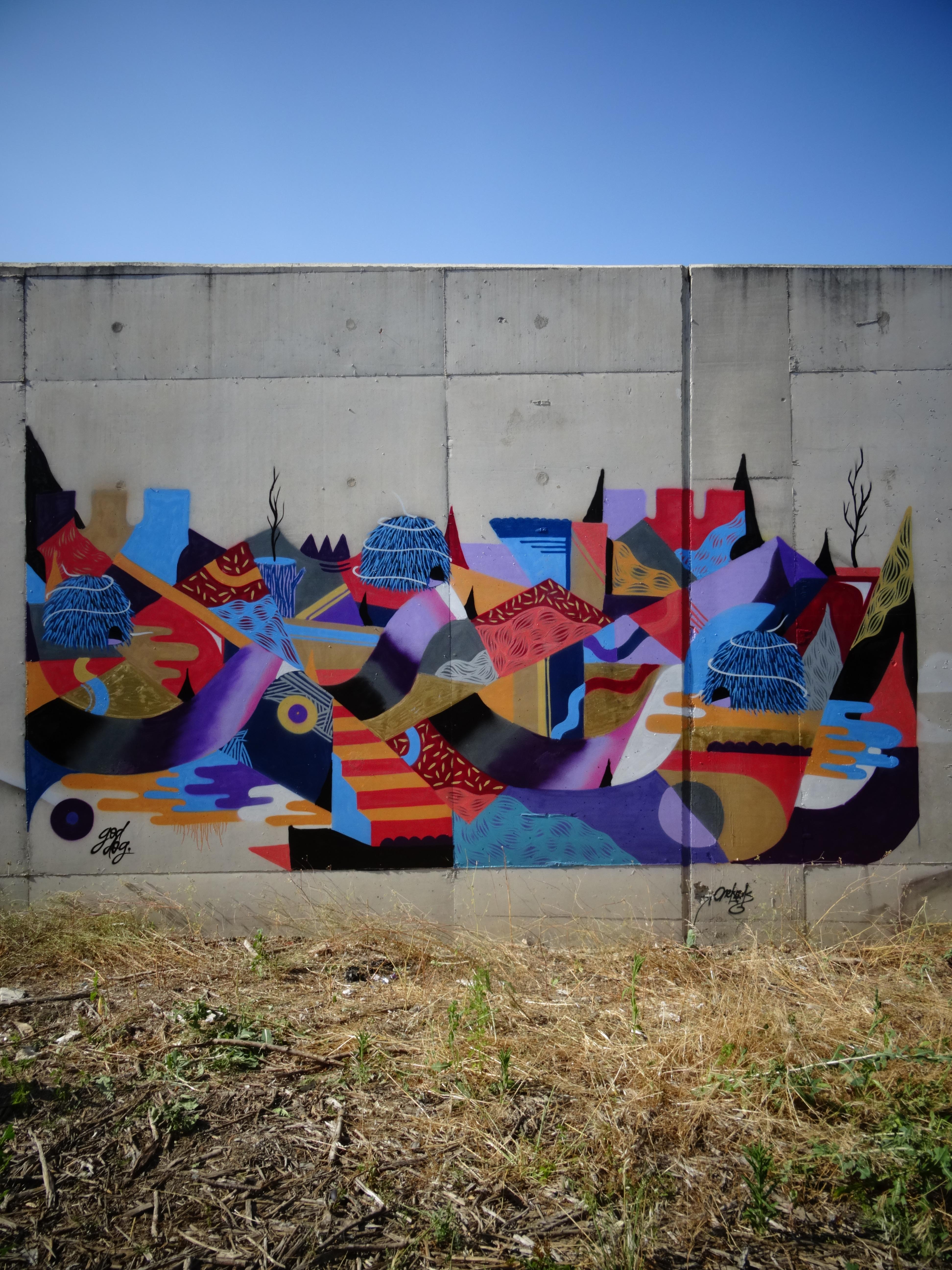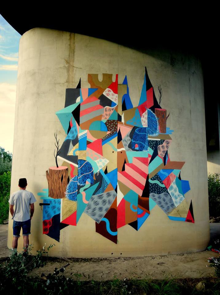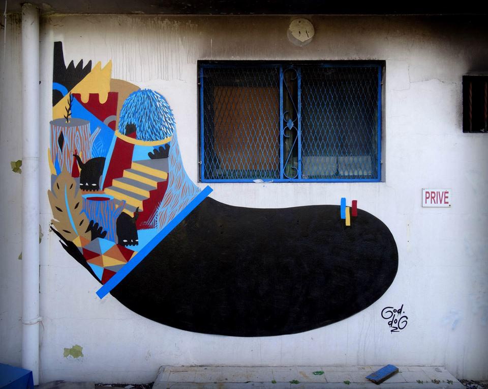 The recent murals of French street artist GoddoG show an interesting evolution of his style, from his well-known figurative imagery to an approach focused on geometric patterns, chromatic contrasts and the insertion of natural elements rather than human-like characters.