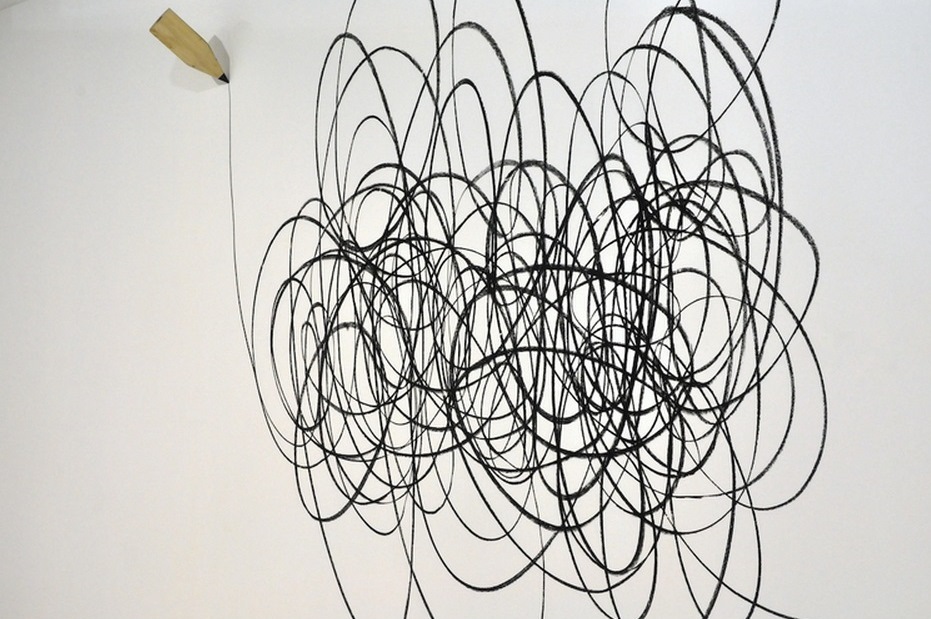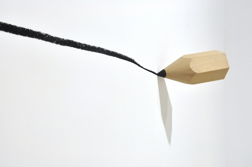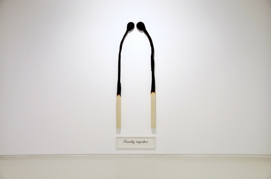 Playing with the scale of the represented objects, placing them in the margins or filling the center of the space, the artist distorts reality in order to highlight the bold messages attached to his unnaturally amplified matches or pencils, which through these changes in size gain new meanings and even their own identity through personification. Although we notice the absence of man, we feel the human presence in the traces of the pencils or the large post-it note on the wall. The viewer becomes an accomplice in this impossible world, temporary accepting its existence, a mix of minimalism, pop and surrealism expressed using various techniques – drawing, painting, sculpture and murals.