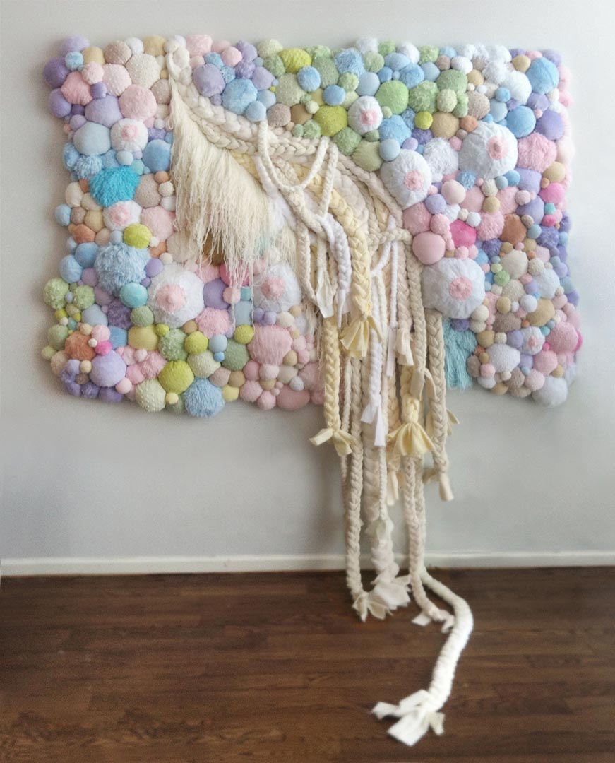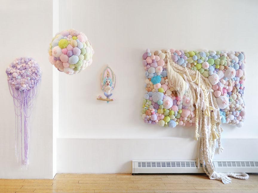 The recent works of New York based fine artist Jaz Harold include sculptures that “soften the emphasis on the ego, ritual, intimacy, and stigma that society generally attaches to sex.” Created from plush fabrics, yarns and pastel hues, the works, with their sexual undertones and overtones, actually become an image of innocence and a new kind of beauty. Their innocent appearance, as well as the child-like aesthetic, is perfectly completed by the pastel colour choice.
