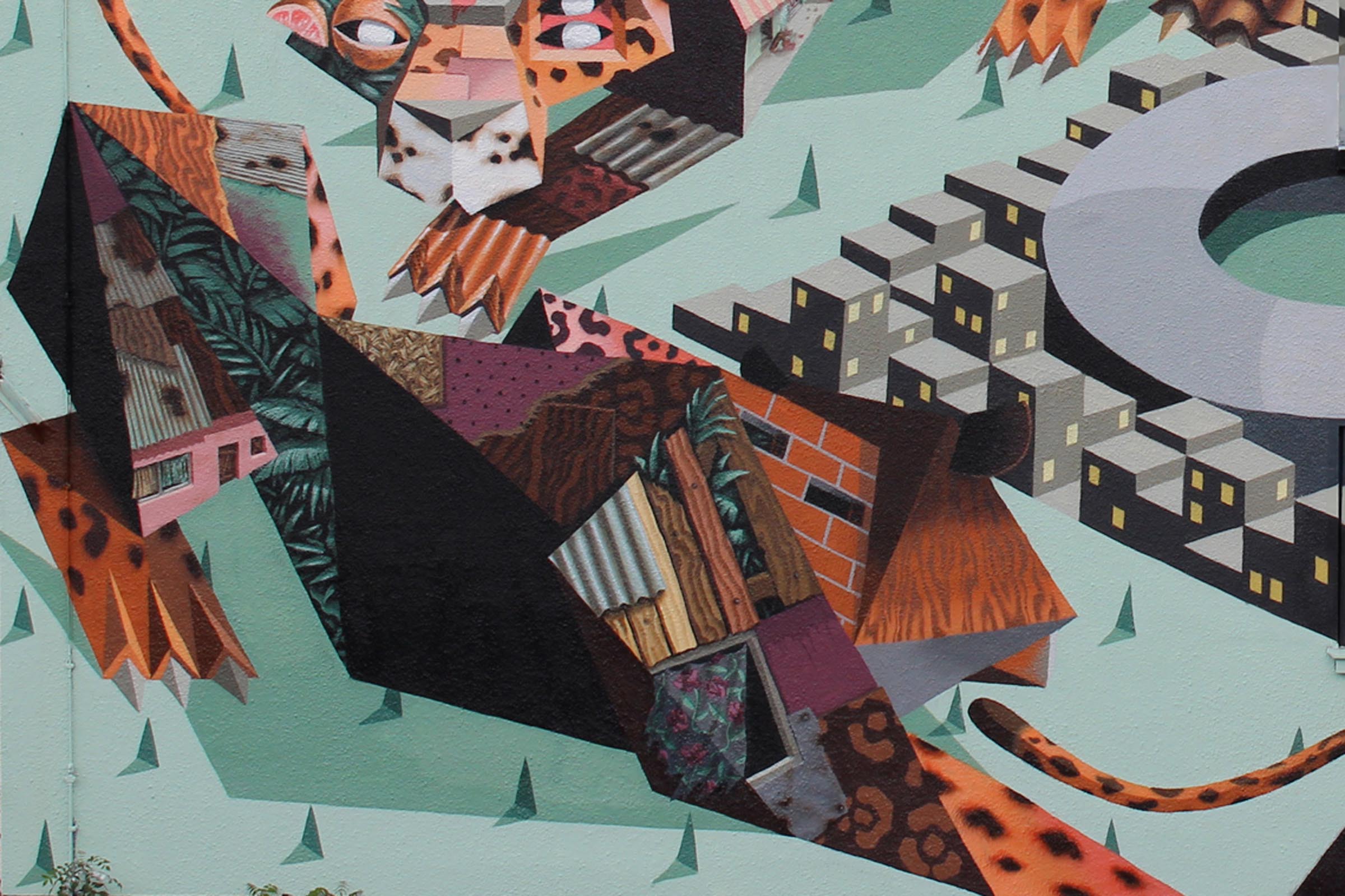 Inspired by Brazil, the piece shows a city surrounded by fantastic tigers, the scene creating a certain tension, as if the animals are ready to attack at any moment. This theme often occurs: “The protagonists of their work embody codes and attitudes of city life, which are in contrast to the natural purity of the animal and nature motifs, also integral to their work. This tension drawn from the ambivalence between urbanity and nature gives rise to a whole Low Bros universe.” And this new world is defined by geometric and organic shapes, cubic effects, vibrant colors and a variety of patterns, all contributing to their surreal imagery.