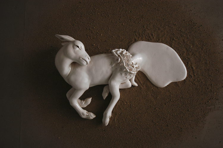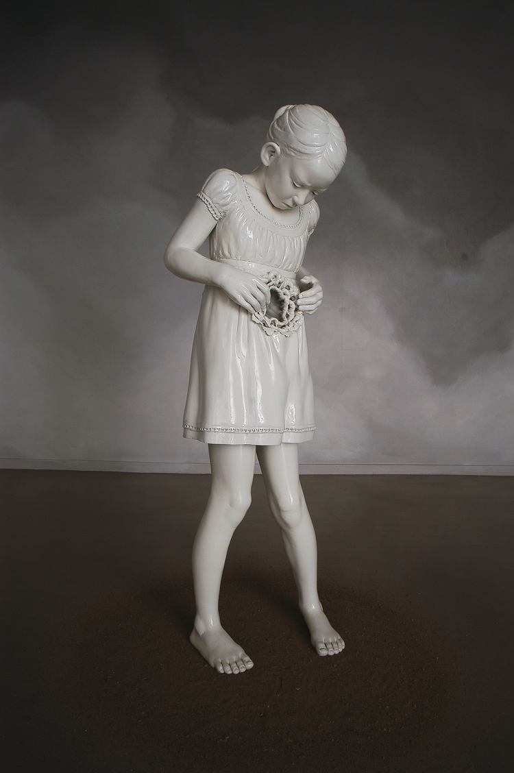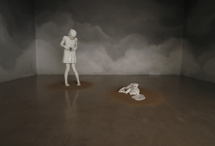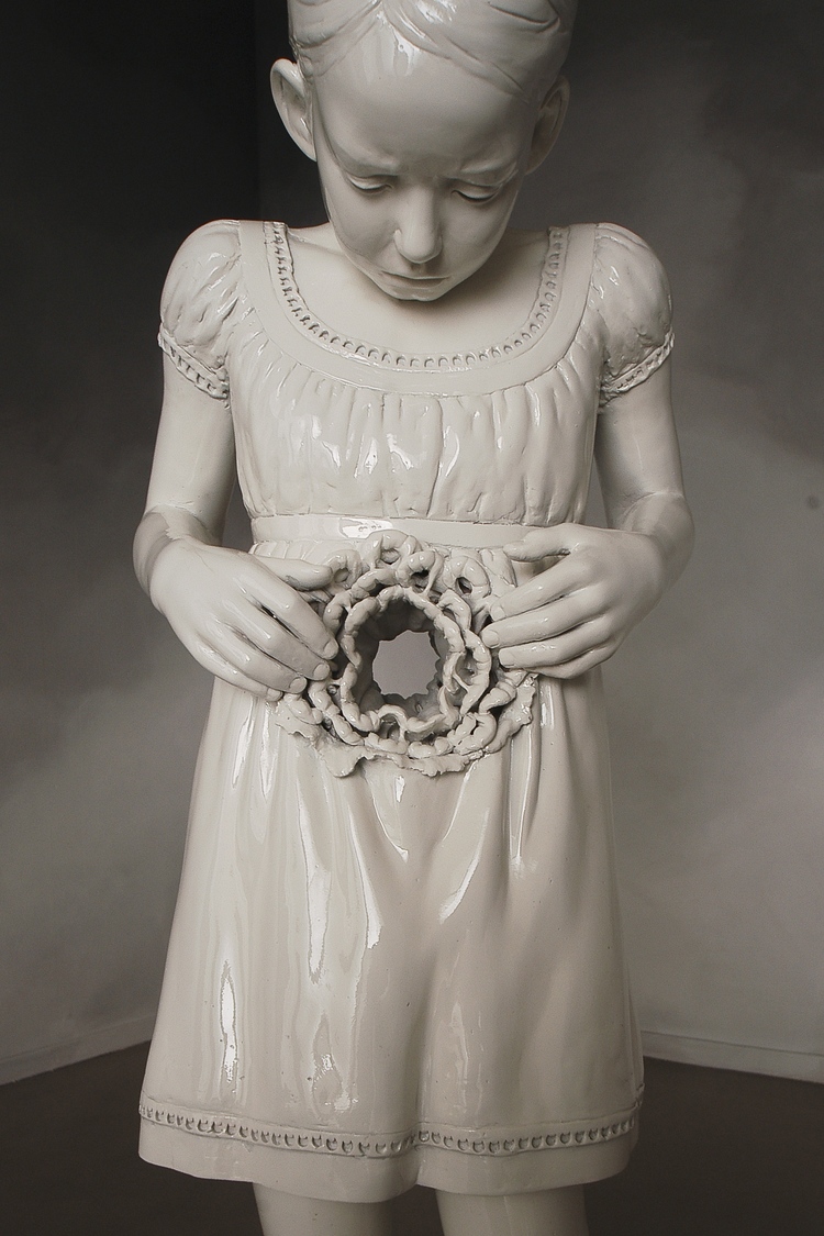 May Snevoll von Krogh creates enthralling ceramic sculptures and installations revealing contrast and tension between a fictitious appearance of innocence and beauty and a grotesque and violent imagery inspired from reality’s cruelty. The fragility of the children represented in her works, their unexpected gestures and inner conflicts occurring in situations far beyond the ordinary become a reflection of the human state of confusion and anxiety in today’s society.