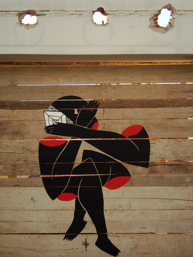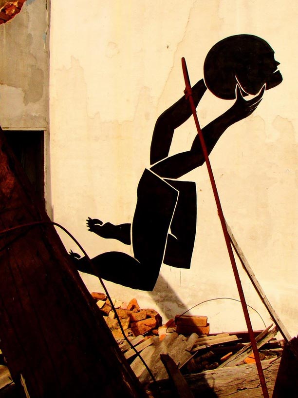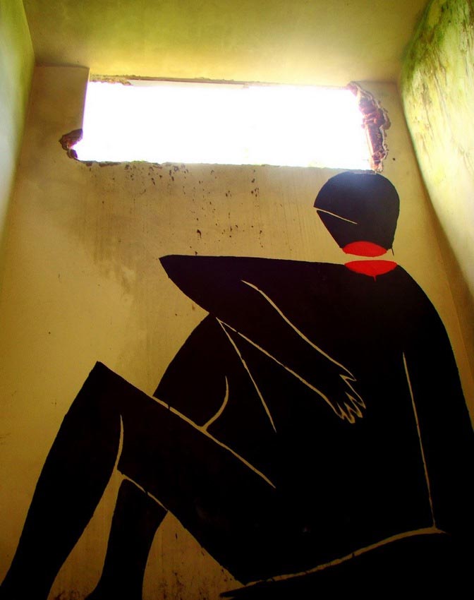 His characters, the “incoherent saints”, are lost in abandoned places or left behind in the ruins of time, “staring at the skies for impossible answers”, tormented, mutilated by their own inner struggles, and hoping to get out of their illusory cages. Their faces are hidden behind geometric masks and dark shades, as perhaps their fate is universal.
