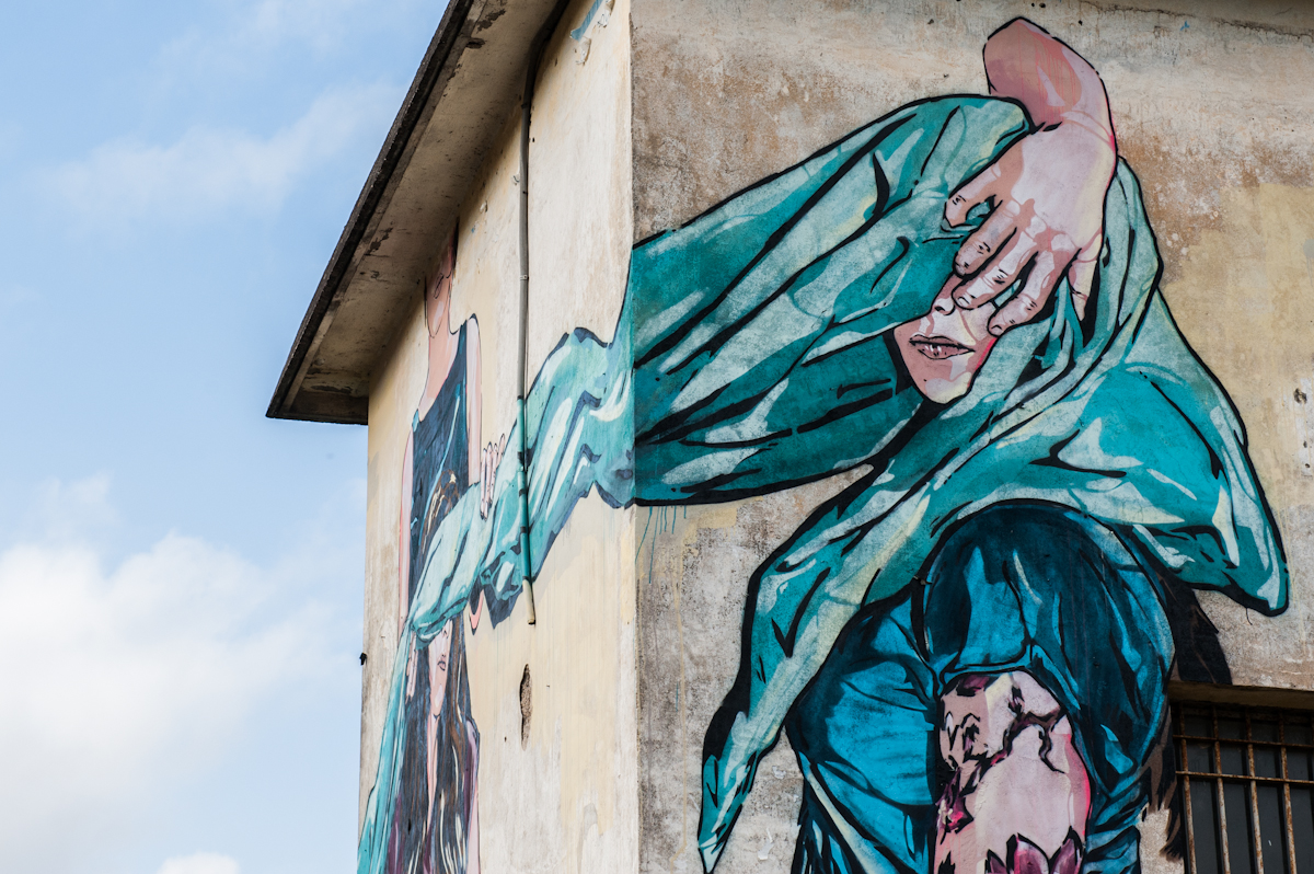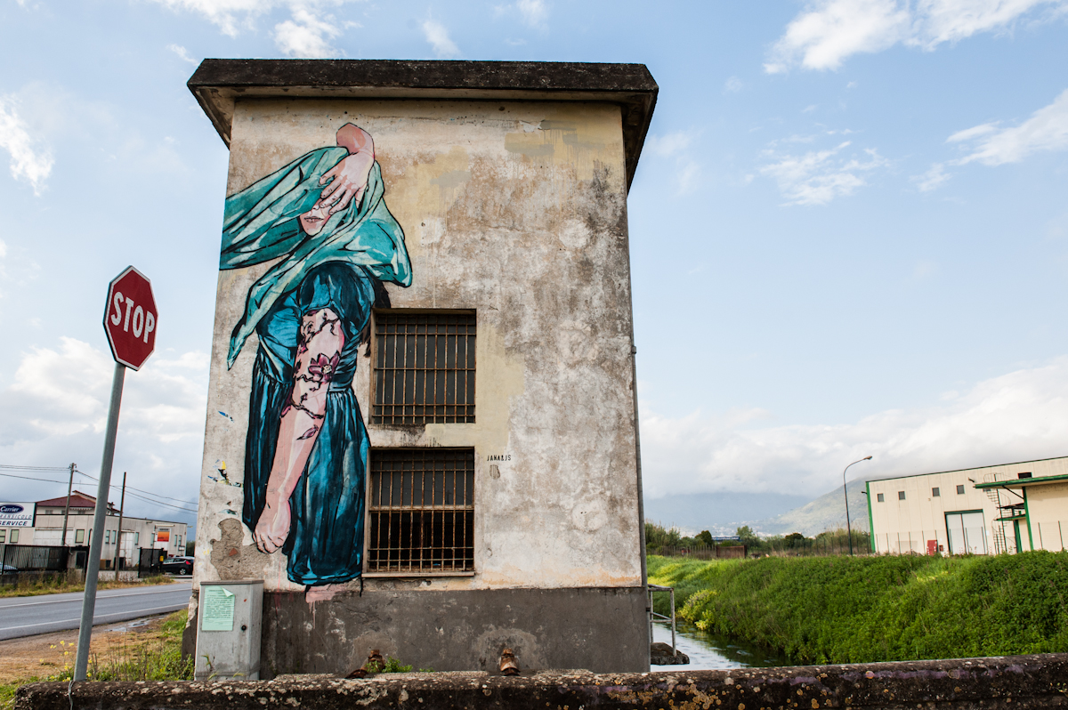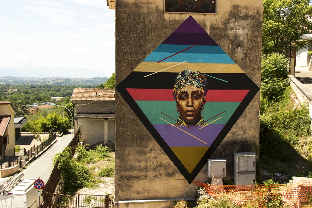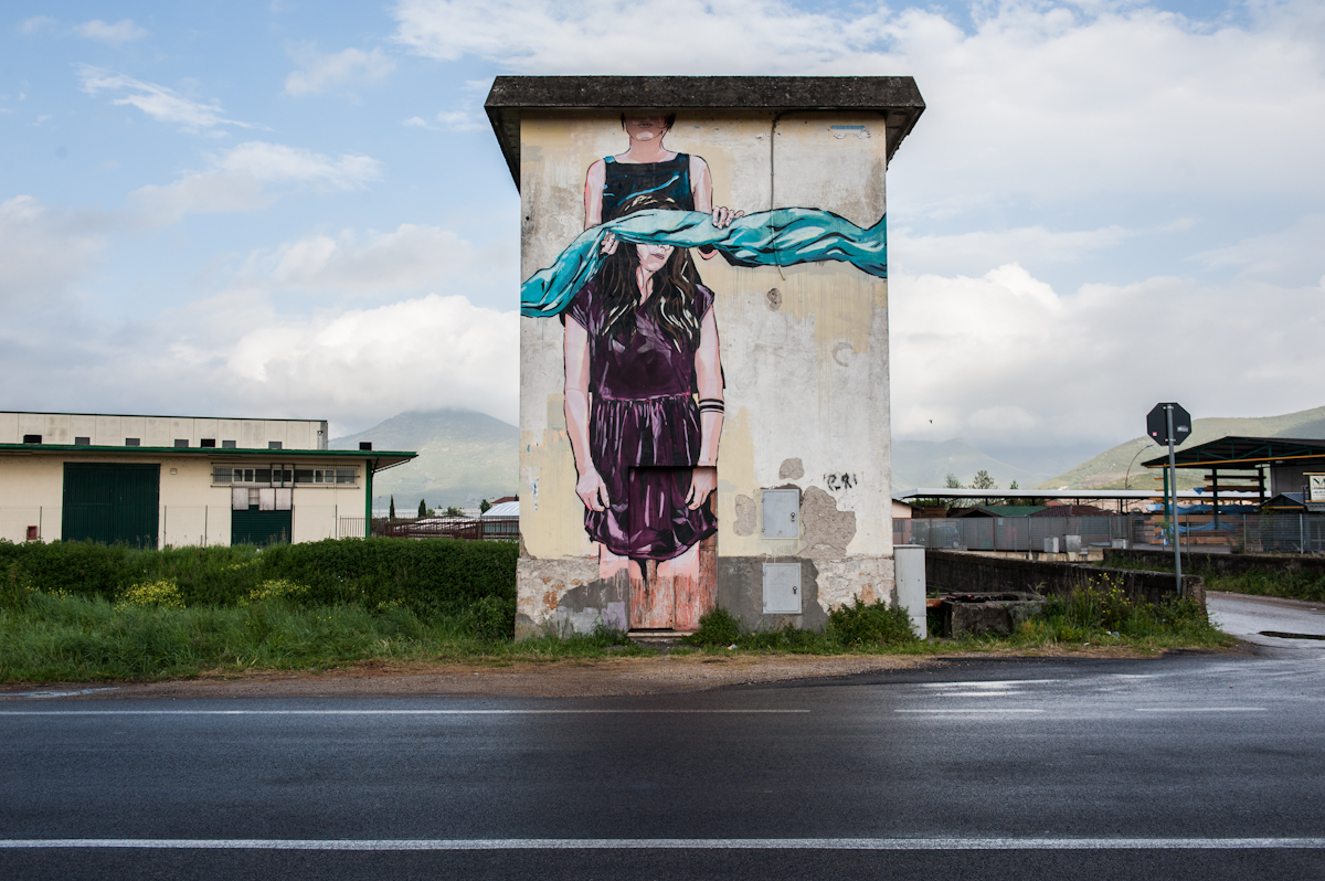 Memorie Urbane 2015 street art festival in Italy continues with the current solo show CROSSING by Levalet, on view at Basement Project Room in Fondi, and with various new pieces, among which a powerful mural by Case Ma’Claim, several interventions by Doa Oa, part of her ongoing reforestation project, the playful Jana & JS piece, the staggering portraits of ECB Hendrik Beikirch and INO, the abstract vortex murals of 1010, the colorful works by BTOY or the dynamic and suggestive pieces by Adomas.