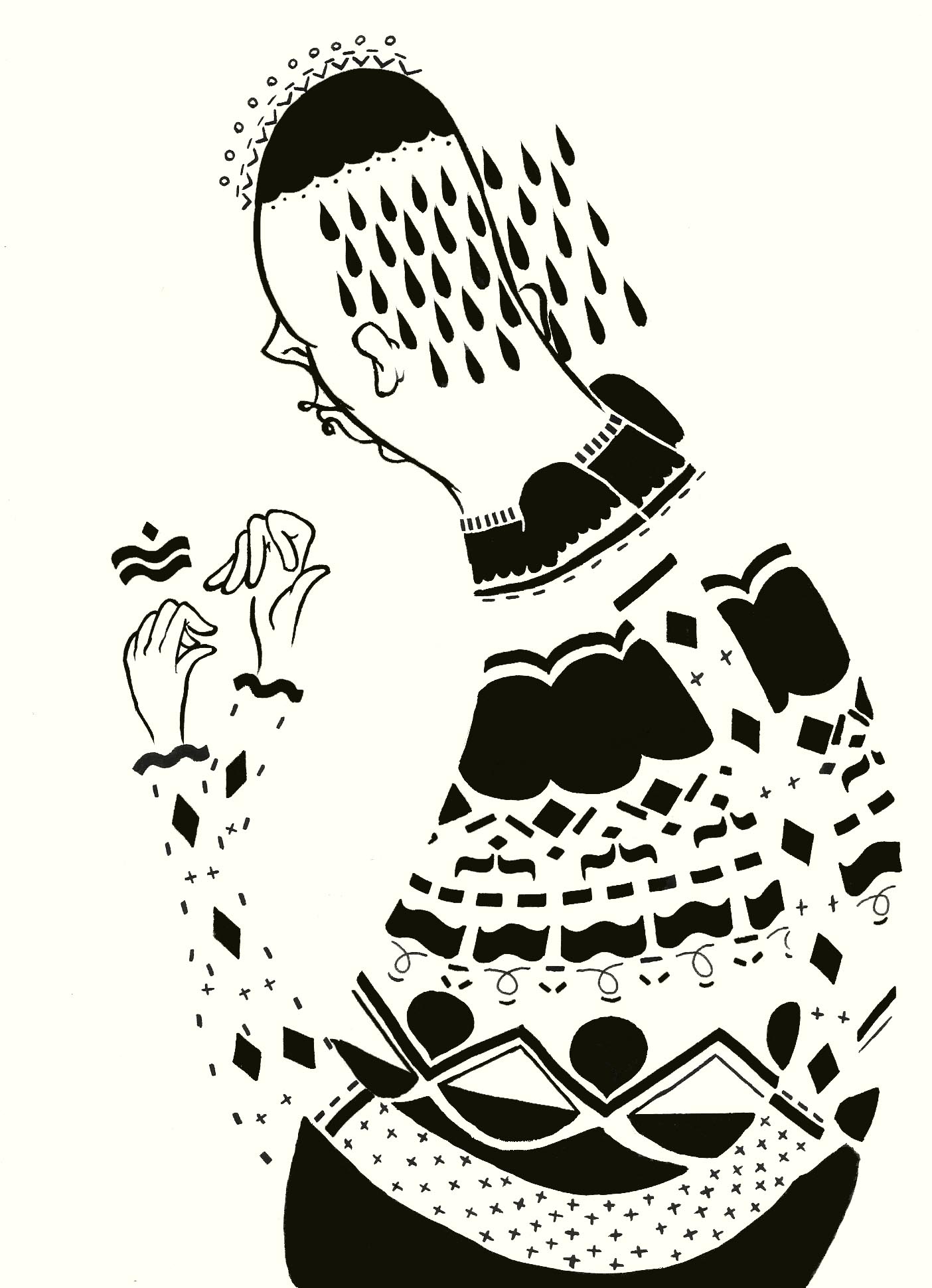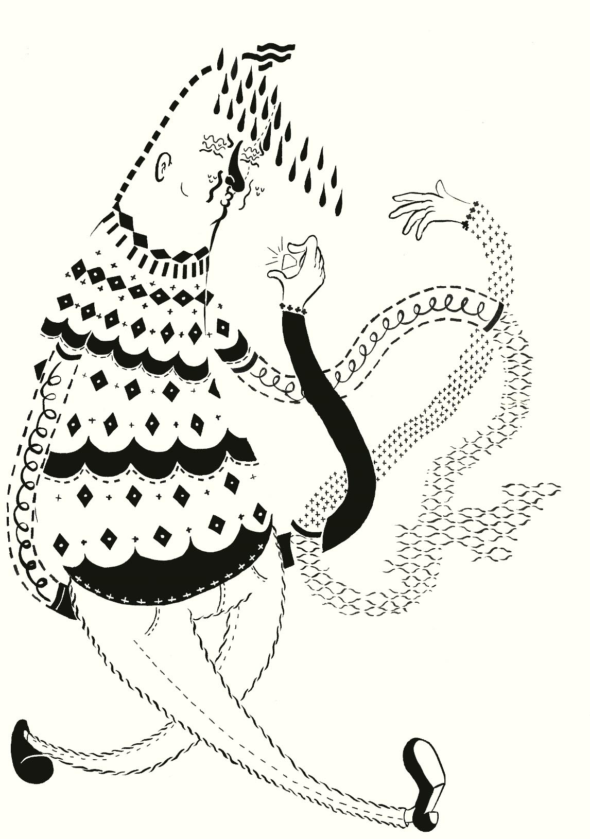“Music helps create a picture in my head of oddly shaped people that have awkward posture and droopy faces. I work a lot with shapes and patterns in my illustrations because the look of contorted body postures combined with these elements creates a movement in my work.”