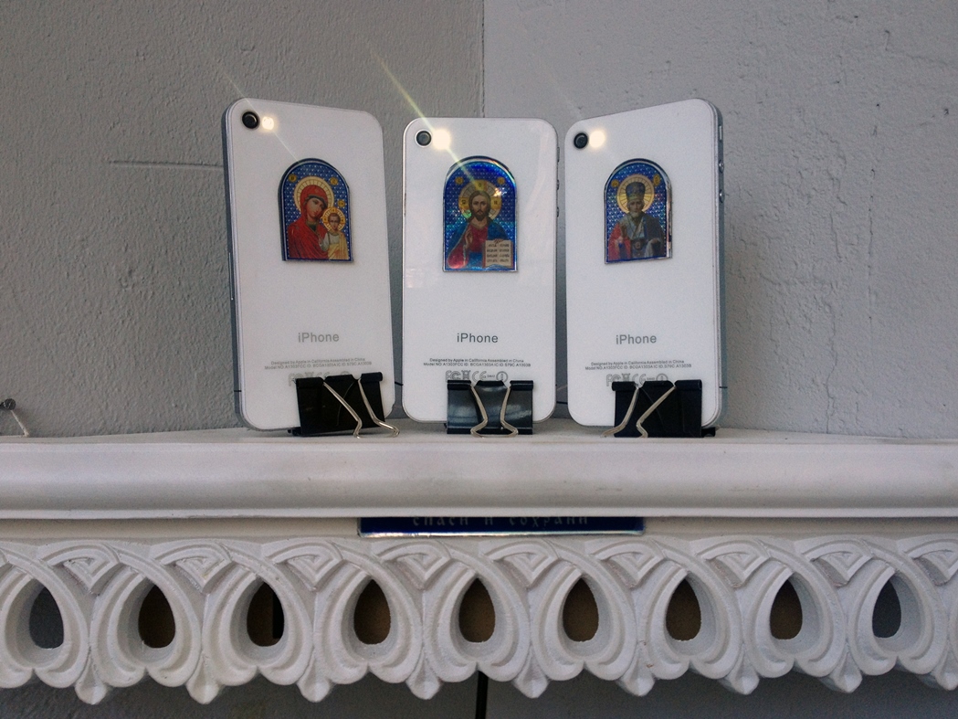 I’ve made a red corner with three iPhones in the traditional form of folding. On each iPhone I pasted consecrated stickers that I’d bought in the church. When a person approaches the object, he is illuminated with a divine flash by a built-in sensor. But the person needs to decide – what kind of icons and relics that flash belongs.”