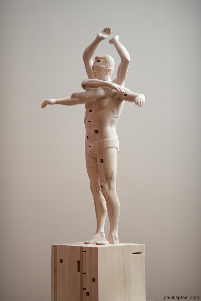 The artist is concerned with time, exploring the present moment as a remix of ‘past and future potentialities’, in a reality where the truth fuses with fiction, resulting in a variety of stories. There is also a fine humour added to some of the hand carved wooden sculptures of Paul Kaptein, as he observes human behavior and captures even the most subtle gestures in unexpected ways.