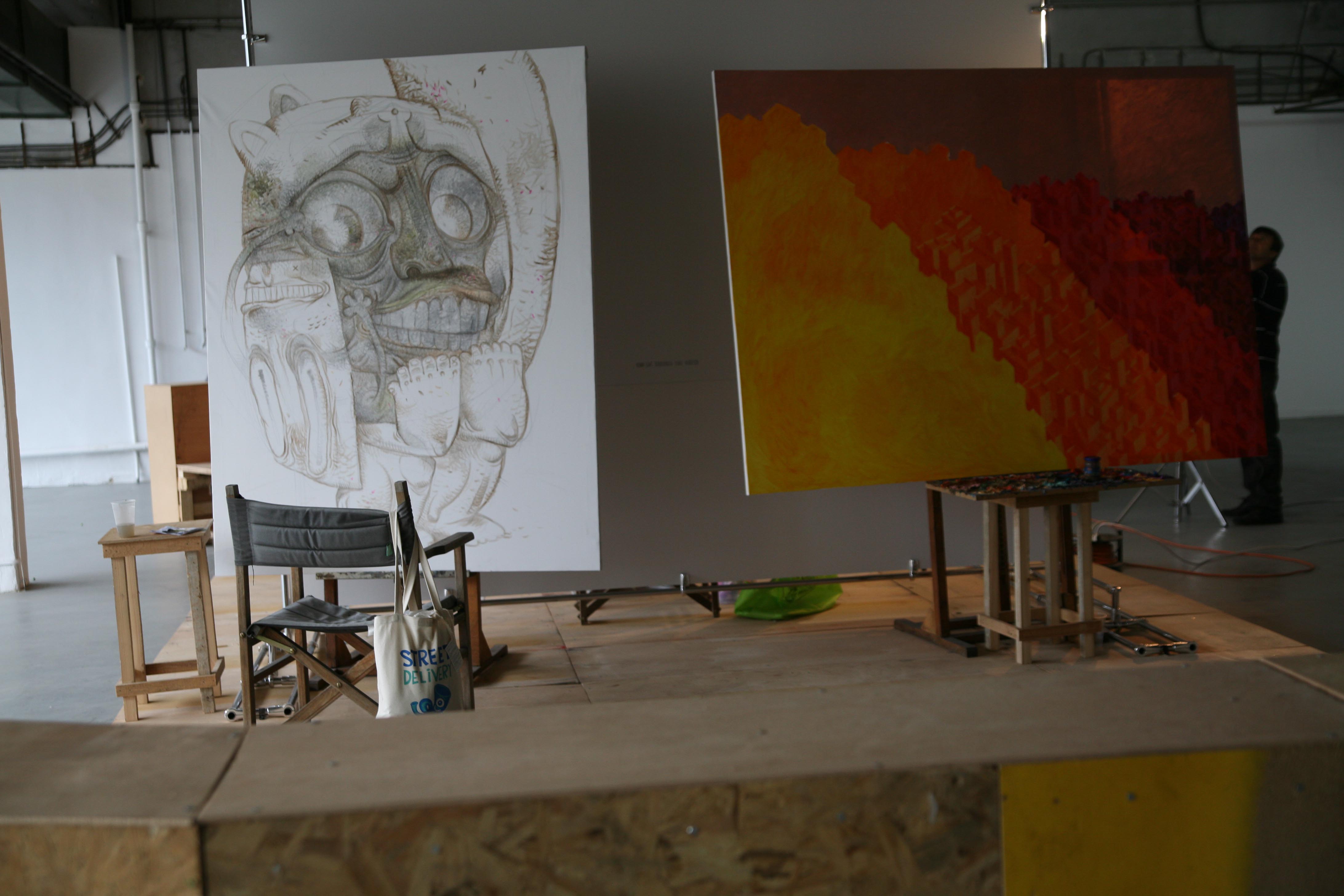 [left to right] Alexandru Ciubotariu / Pisica Pătrată, Selfportrait (2014); Mihail Coșulețu, Building site (2014), performing painting in Shortsighted. Presbyopic. Blindfolded group exhibition at Allegra Nomad Gallery, May 12, 2014. Copyright © 2014 Allegra Nomad Gallery, All rights reserved.