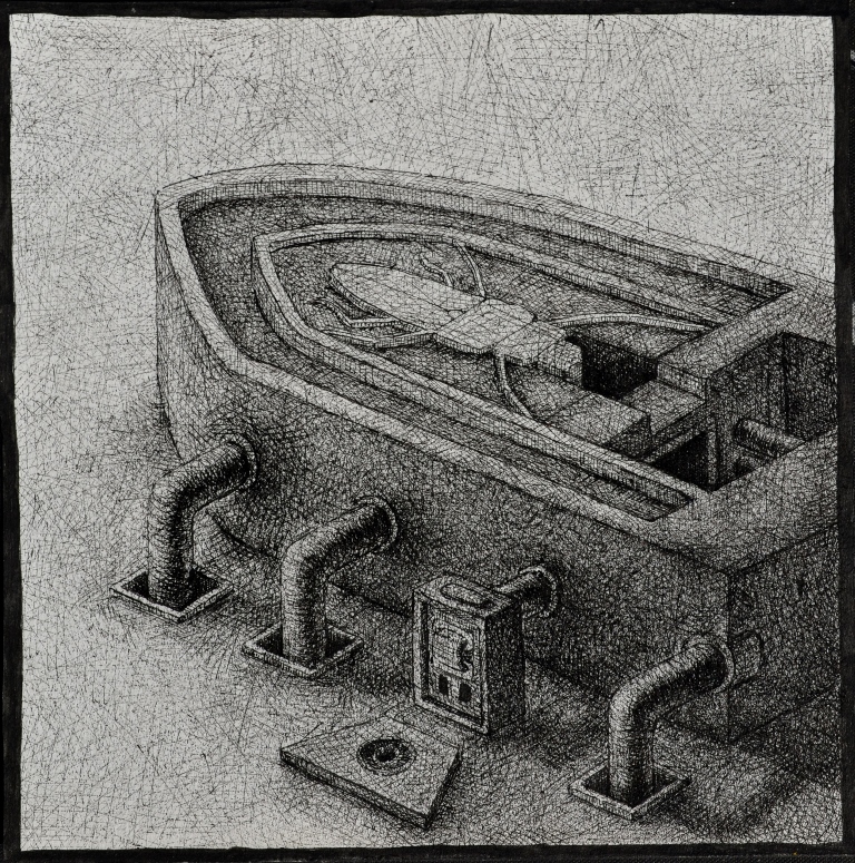 Through hyperbolic details, Sorin Nistor intends to suggest the mutilation of buildings through bureaucratic mechanisms. The detail always seems to take over and remains as a fragment of an essential structure. Apparently, all these isolated fragments do not link to each other through real connections, but rather through a random juxtaposition. Besides the impressive architectural structures and elements that characterize his works, a strong visual impact results from the hybrid creatures that populate this decomposing universe reigned by flies and insects, as well as the use of a limited range of colors.