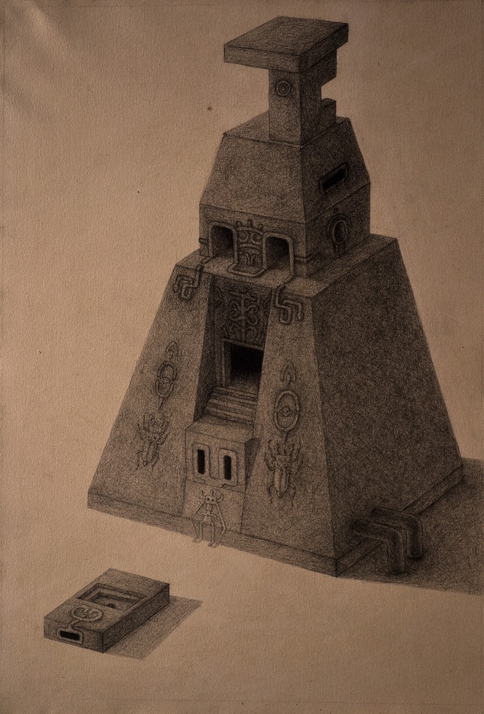 Influenced by architecture, the pencil illustrations, created in Brutalist style, also derive from Science Fiction and Fantasy, belonging to a different horizon, experienced through a temporal shift towards a utopian ideology, where the once ordinary and familiar laws no longer apply.